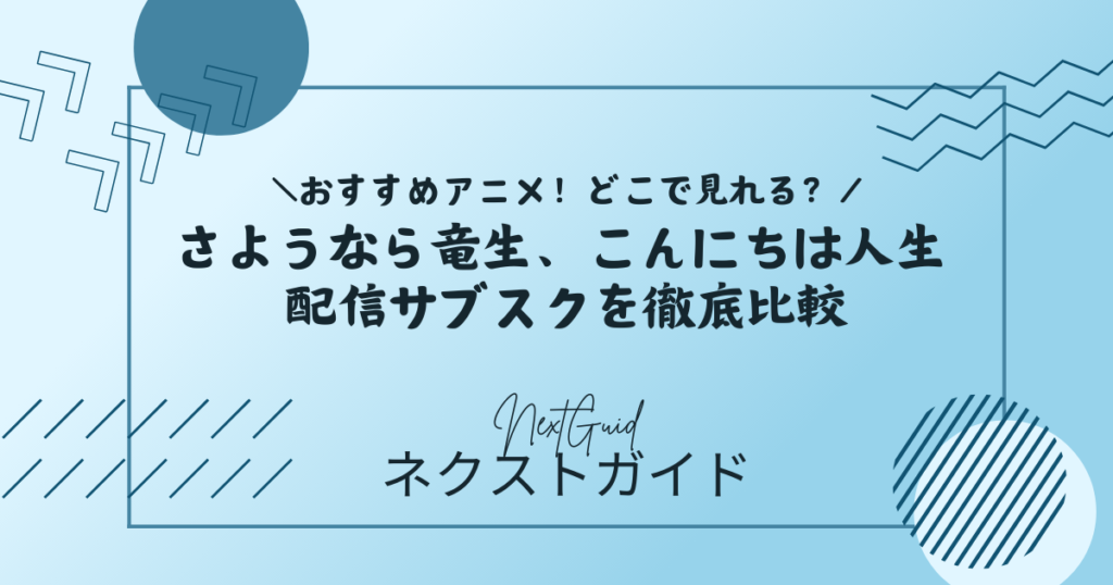 アニメ『さようなら竜生、こんにちは人生』は、U-NEXT、ABEMA、Hulu、Amazonプライム・ビデオ、dアニメストア、DMM TVで配信確認済みです。特にU-NEXT、ABEMA、Hulu、dアニメストア、DMM TVは作品ページが確認でき、全12話の掲載が把握しやすい配信先です。Prime Videoは作品ページがあるものの、ページ上では**「アニメタイムズまたはその他チャンネルへの加入、またはレンタル」**という表示があり、実質的に追加課金の可能性を考える必要があります。
