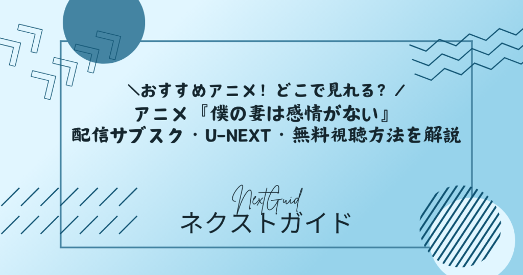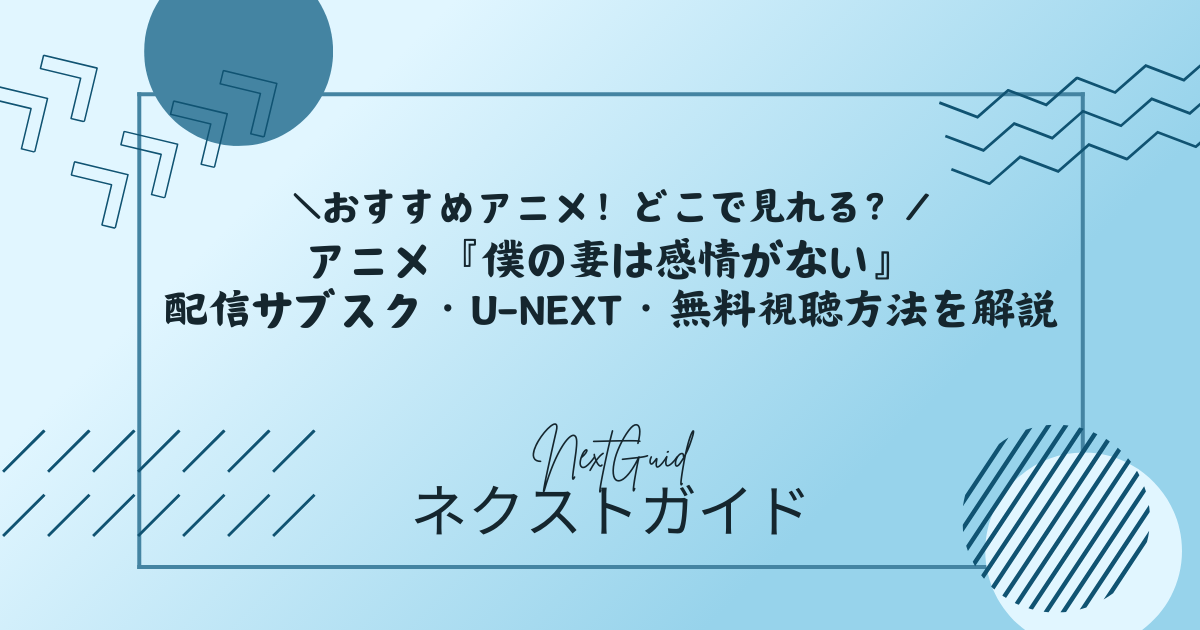 アニメ『僕の妻は感情がない』の配信先を探している方へ向けて、本記事では「どのサブスクで見られるのか」「どこが一番お得か」「U-NEXTで本当に全話見られるのか」をわかりやすく整理します。『僕の妻は感情がない』は、TVアニメ公式サイトでABEMAの先行配信と、U-NEXT・dアニメストア・Prime Videoなど複数サービスでの順次配信が案内されており、U-NEXTでも作品ページが公開されています。この記事では、主要サブスクの料金や無料体験の有無、作品情報、声優、制作会社、各話の見どころまでまとめて確認できるようにしました。結論からいうと、アニメ以外の映画・ドラマ・マンガまでまとめて楽しみたいなら、31日間無料トライアルがあるU-NEXTが使いやすい選択肢です。