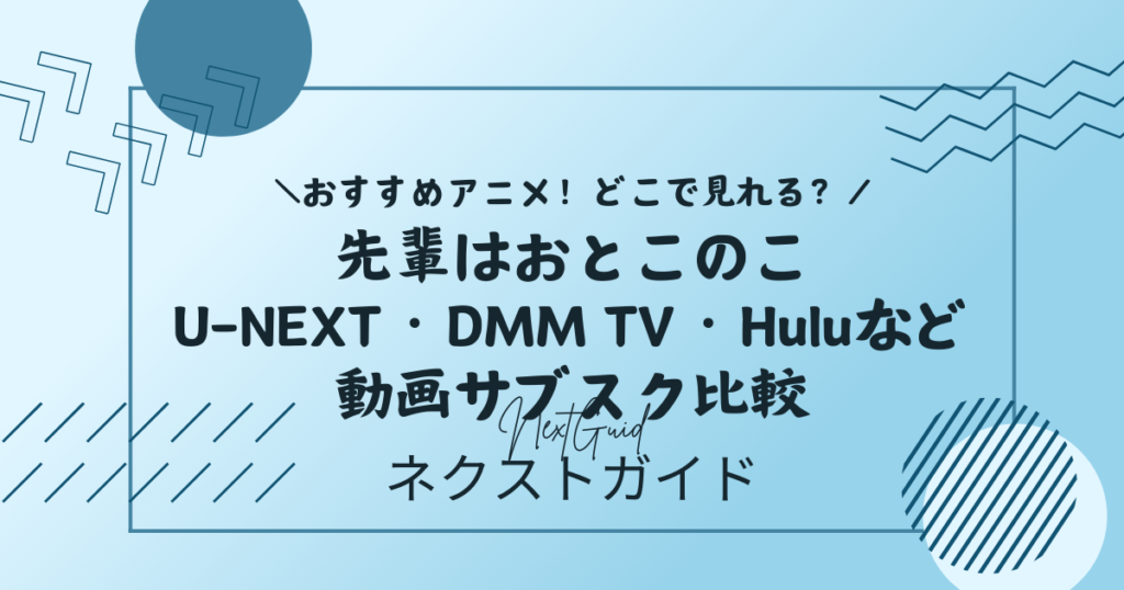 アニメ『先輩はおとこのこ』は、2026年3月7日時点でU-NEXT、DMM TV、dアニメストア、Hulu、Amazonプライム・ビデオ、ABEMAで視聴先を確認できます。作品を見つけやすさだけでいえば主要サブスクに広く入っているため、「どこでも見られる作品」に近い立ち位置です。ただし、無料トライアルの有無、月額料金、アニメ以外の強みはサービスごとにかなり違います。特にU-NEXTは31日間無料、DMM TVは14日間無料、dアニメストアは初月無料があり、HuluとABEMAプレミアムには無料トライアルがありません。最初に比較表で全体像をつかんでおくと、自分に合うサービスを選びやすくなります。