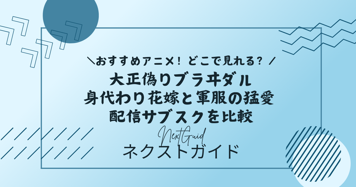 アニメ『大正偽りブラヰダル~身代わり花嫁と軍服の猛愛』は、U-NEXTで見放題配信が確認できます。加えて、DMM TV、dアニメストア、ABEMA、Amazon Prime Videoでも配信情報が確認できました。一方で、今回確認した範囲ではHuluの作品ページは見当たらず、少なくとも主要比較対象の中ではU-NEXTが有力候補です。なお、本作は2024年10月放送の全8話作品で、dアニメストアでは「全8話」と明記されています。